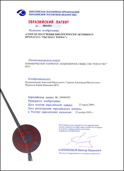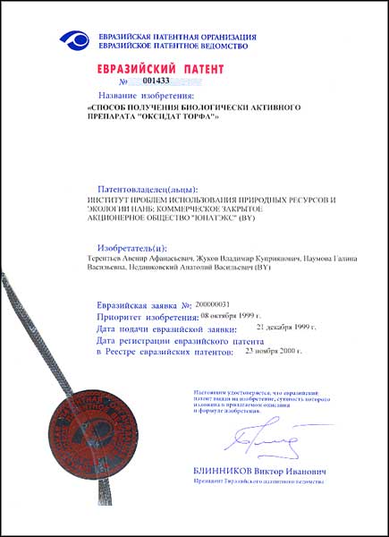 Способ получения биологически активного препарата "Оксидат торфа" от 23.11.2000 | Способ получения биологически активного препарата "Оксидат торфа" от 23.11.2000 |